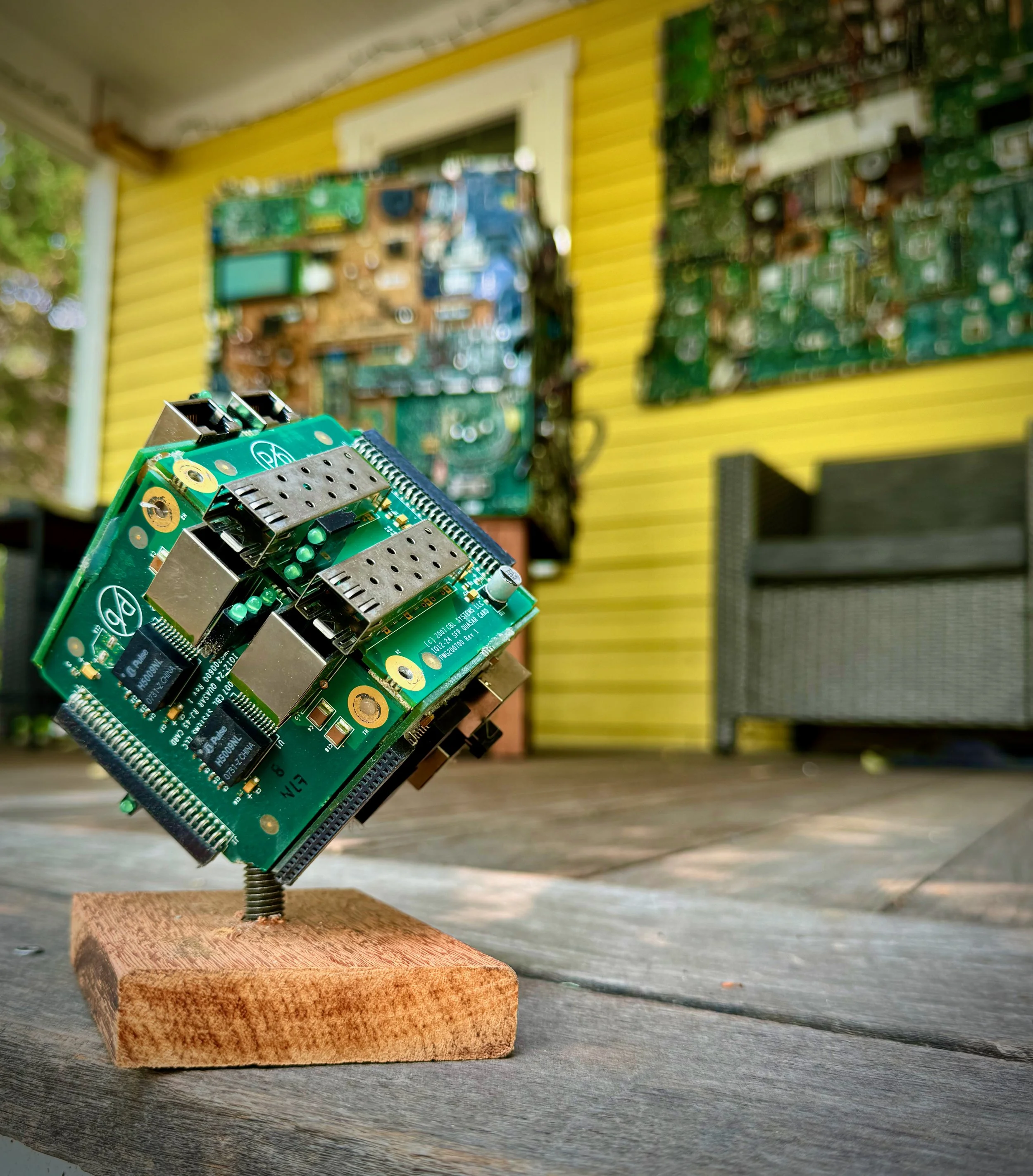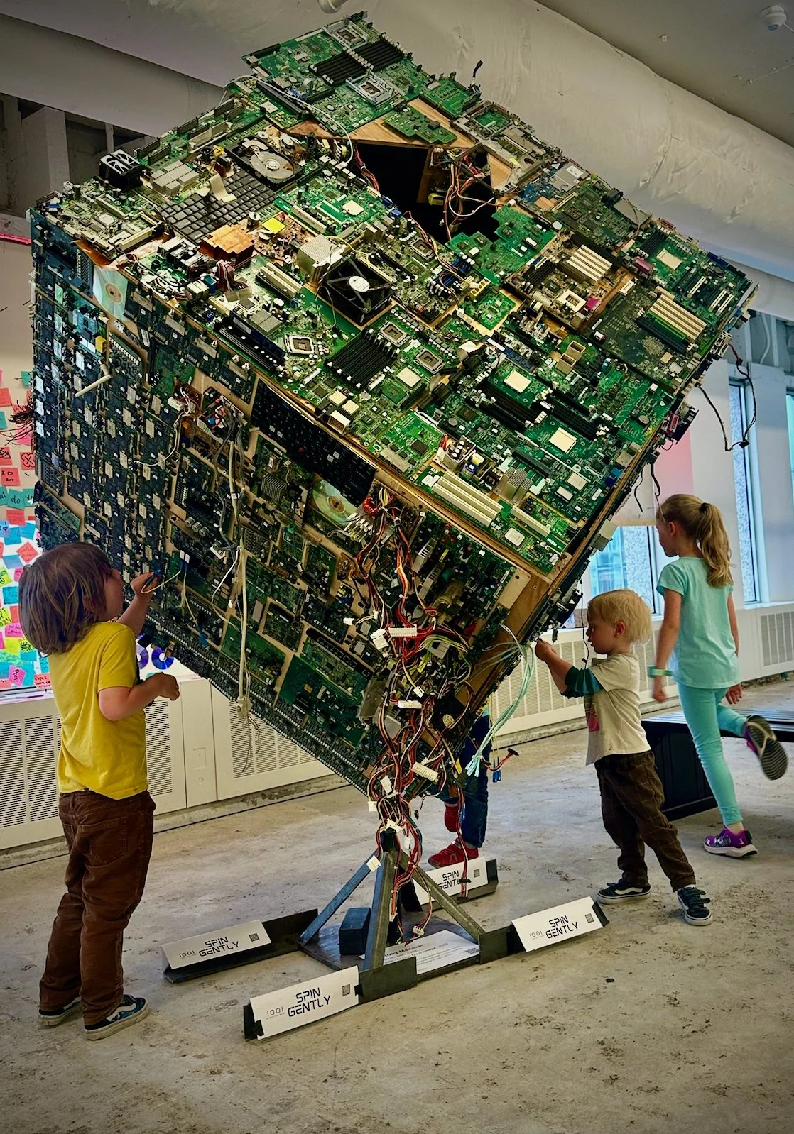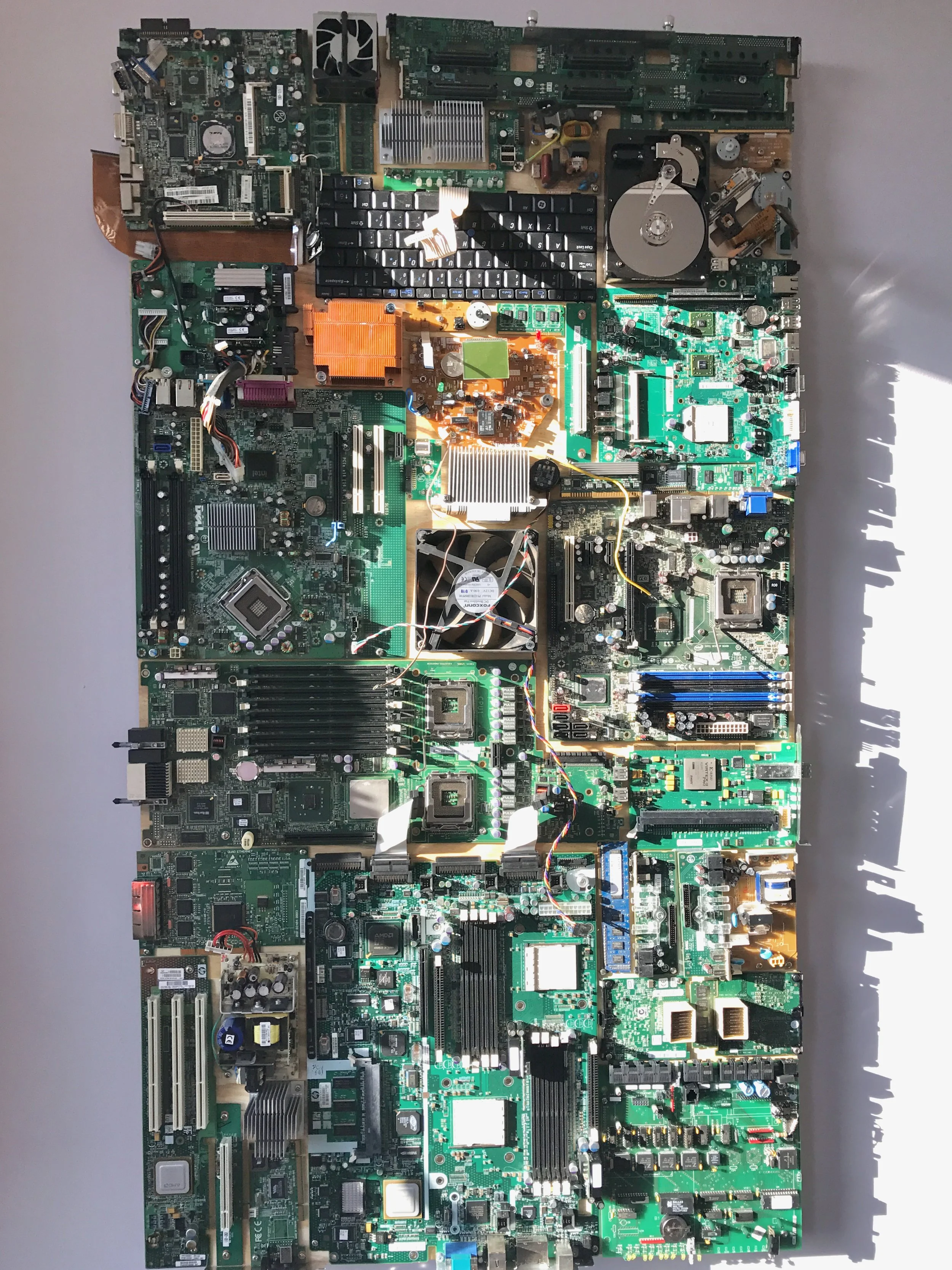 I use repurposed materials to create vibrant sculptures and technomosaics that invite people to contemplate their relationship with technology. I’ve had two exhibitions. Hidden Beauty exposed the artistry and ingenuity of human beings usually hidden beneath drab protective cases. 1001 - In Our Own Image focused on an 8-foot-tall 800-pound circuit board-clad 4’x4’x4’ interactive spinning cube.
